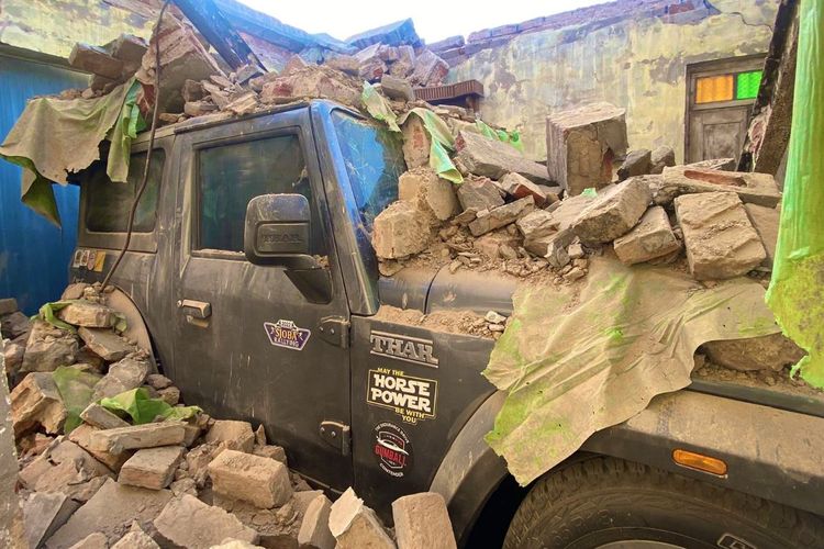 Viral di media sosial X sebuah postingan yang memperlihatkan satu unit SUV Mahindra Thar tidak gepeng meski ketiban garasi roboh