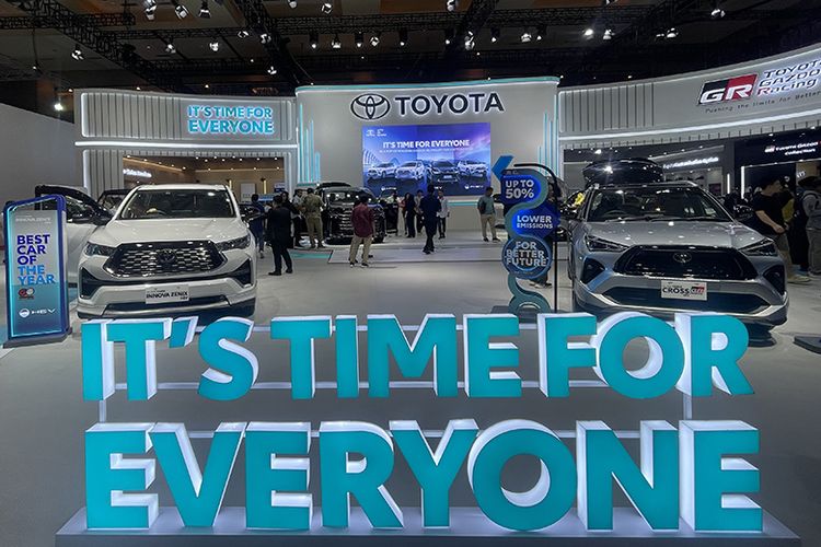 Tiga mobil listrik yang dipajang di bagian depan booth Toyota adalah Innova Zenix, Yaris Cross HEV, dan Corolla Cross HEV.
