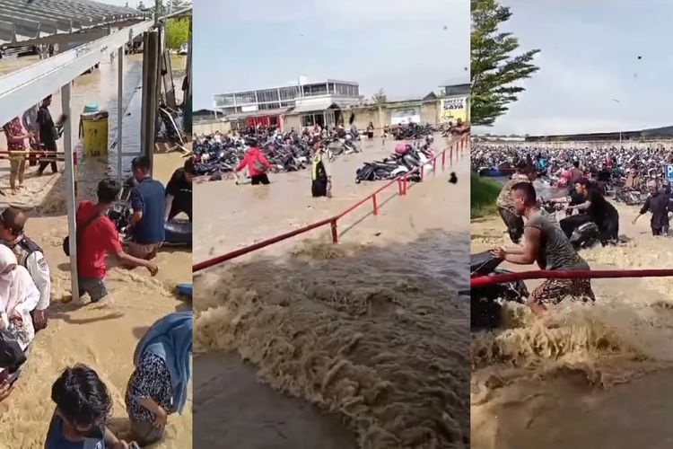 Banjir Cirebon membuat ribuan motor terendam, salah satunya di kawasan pabrik di mana parkirannya dihuni banyak sekali motor.