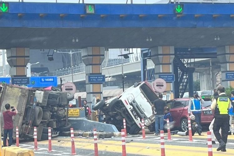 Diduga berkendara secara ugal-ugalan, Truk Isuzu Traga sebabkan kecelakaan beruntun di Gerbang Tol Halim Utama, Rabu (27/3/2024)..