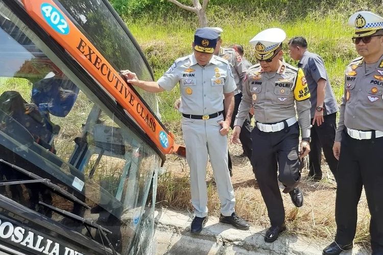 Kecelakaan tunggal yang melibatkan bus PO Rosalia Indah terjadi di Km 370 A Tol Batang-Semarang, Jawa Tengah (Jateng).