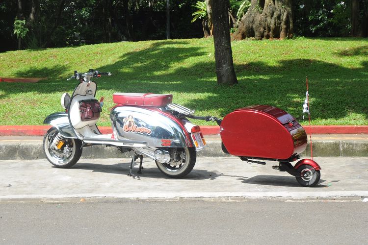 Royal Alloy Tigara Grande keluaran 2023 milik Andre Mendean dari workshop Bellissimo Scooter terbilang unik karena dipasangkan anghang atau trailer