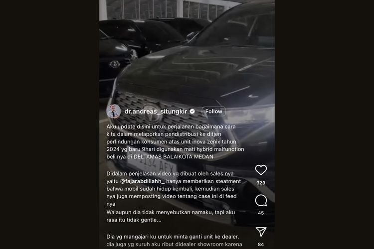Pemilik Toyota Kijang Innova Zenix Hybrid bernama dr. Andreas Henfri Situngkir mengeluhkan masalah mobilnya mati dalam posting Instagram-nya.