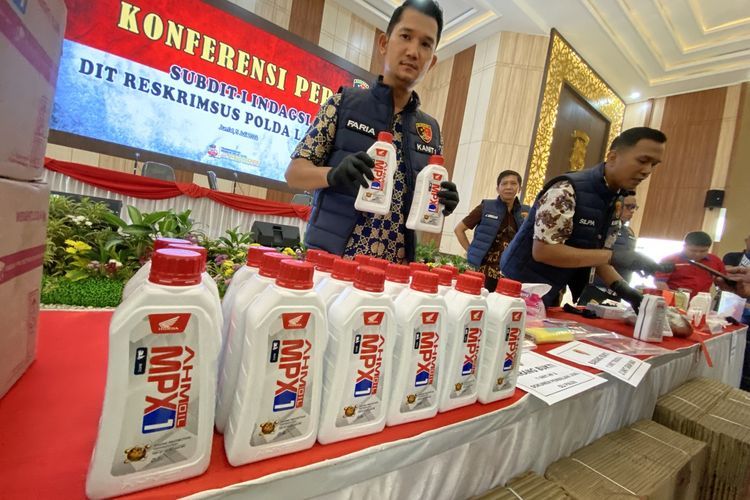 Polisi menunjukan cara membedakan oli AHM MPX 1 asli dan palsu lewat kemasan luar saja, fokus ke beberapa bagian ini