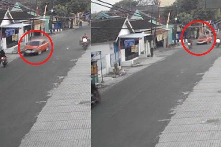 Toyota Corolla DX mendadak oleng di jalan kampung dan melesat terjang dua pemotor yang melaju pelan dari arah berlawanan