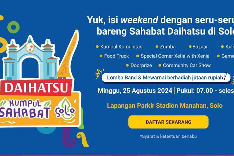 Mau cek kesehatan gratis bisa sambangi Daihatsu Kumpul Sahabat di Solo. Berlangsung pukul 07.00 WIB hingga selesai