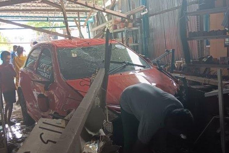 Toyota Etios obrak-abrik toko bangunan sampai ke depan kasir. Pengemudi diketahui adalah abdi negara