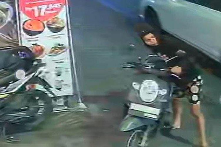 Rekaman CCTV pria pakai hoodie dan celana kolor polkadot gasak Honda Scoopy di parkiran restoran Siwalankerto, Wonocolo, Surabaya