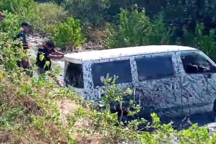 Daihatsu Luxio mandi lumpur di tengah-tengah rawa usai sopir tertidur dan memilih bablas di jalan menikung