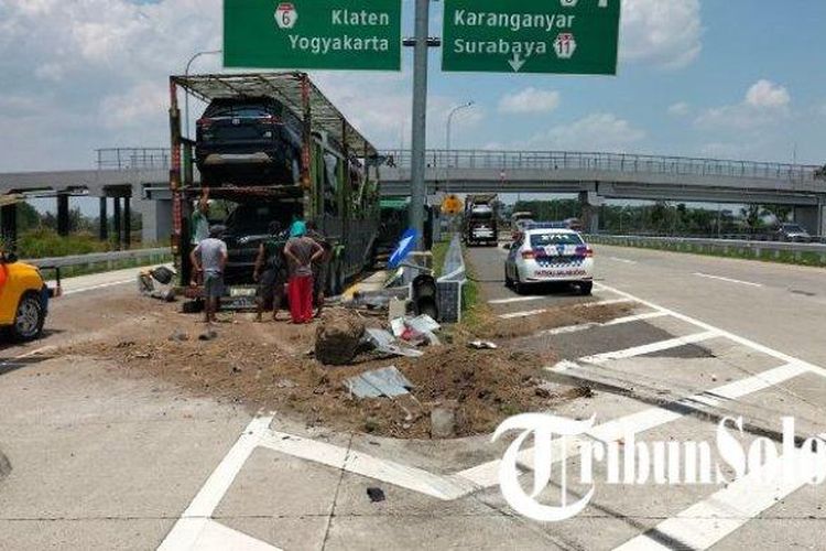 Toyota Etios kena sundul truk trailer muat mobil baru di Tol Boyolali. Berawal pengemudi buka google maps