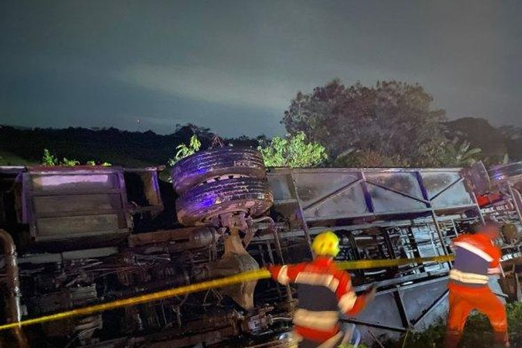 Bus PO Tjipto Gunung Mas terguling di tol Pekalongan usai banting setir hindari Pajero Sport goyang kanan