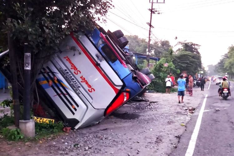 Lumba biru Jatim alias bus PO Sumber Selamat terguling di Maospati Magetan, sopir hindari pemotor mabuk jatuh di tengah jalan