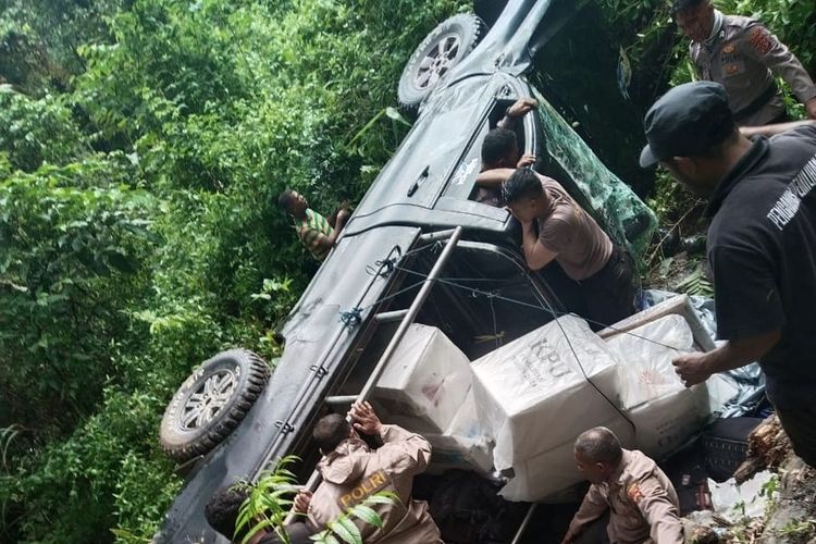 Toyota Hilux pengangkut logistik pilkada terbalik usai koprol ke jurang di Desa Persiapan Waegarahi, Fenaleisela, Kabupaten Buru, Maluku