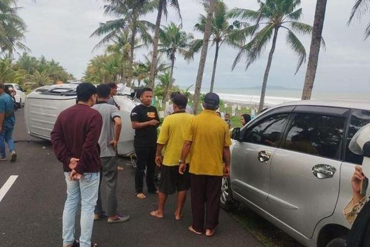 Kecelakaan dua Toyota Avanza saling adu banteng di tepian pantai Batu Hiu, Parigi, Pangandaran, satu unit terkapar