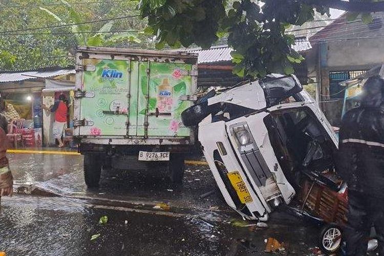 Angkot ngetem di Sriwedari, Gunungpuyuh, Kota Sukabumi tiba-tiba koprol menindih gerobak cilok hingga hancur ulah truk boks