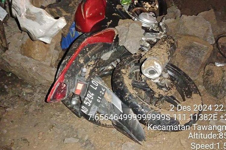 Yamaha V-Ixion dan Kawasaki Kaze di dalam bengkel motor tertimbun puing bangunan akibat tanah longsor di desa Tangkil, Tawangmangu, Karanganyar