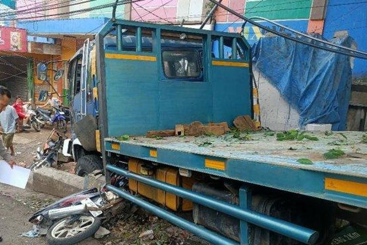 Dua motor digilas truk Hino di jalan menurun, efek rem gagal fungsi alias blong. Berakhir berhenti usai tabrak tembok dan toko bangunan