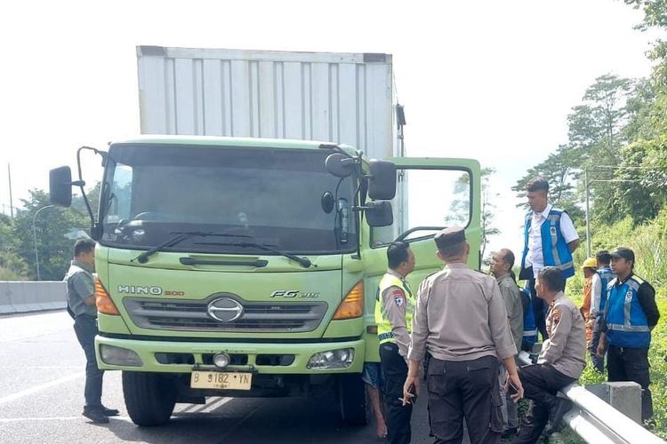 Sopir truk boks Hino nopol B 9182 YN ditemukan tewas gantung diri menggunakan seutas tali rafia di tangkai spion sisi kiri di tol Semarang-Solo