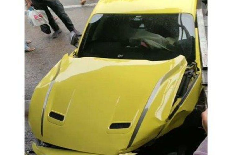 Ford Mustang kuning babak belur di pinggir jalan diduga kecelakaan usai tergelincir jalan yang licin. Bumper dan bodi bonyok