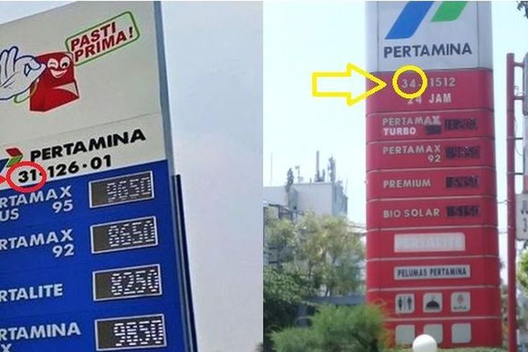 Angka pada plang di Stasiun Pengisian Bahan Bakar Umum (SPBU) menandakan kepemilikan dan operasional.
