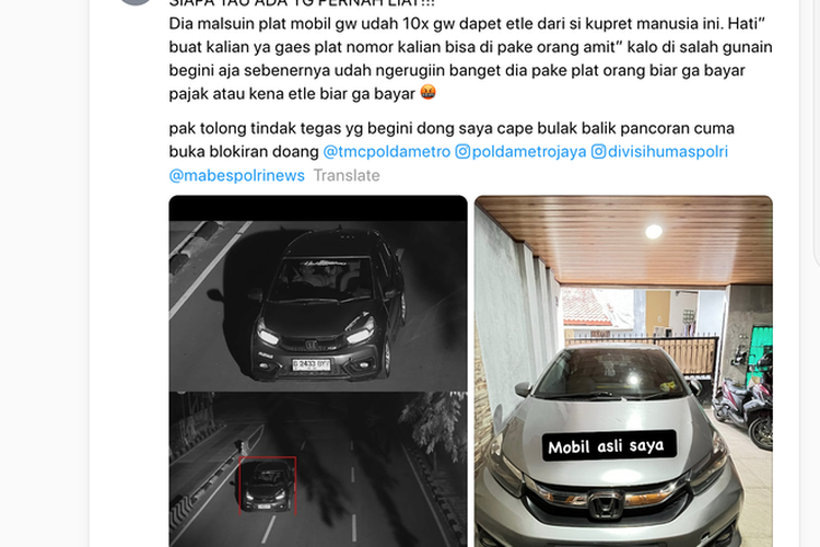 Pemilik Honda Brio ini jengkel karena sudah 10 kali mendapat tilang elektronik salah alamat akibat pelat nomornya dipalsukan mobil lain
