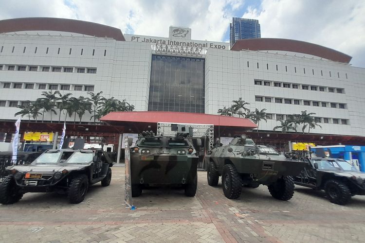 Sejumlah kendaraan taktis tempur milik TNI Angkatan Darat disiagakan di area terbuka JIExpo Kemayoran, Jakarta, tempat berlangsungnya IIMS 2025
