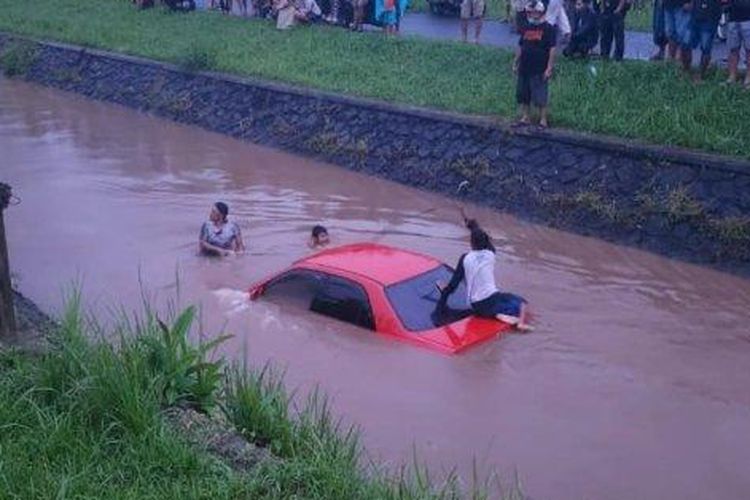 Kabin sedan merah ini dipenuhi air usai bak berendam di saluran irigasi. Berawal sopir kaget hindari emak-emak di jalan sempit