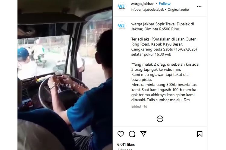 Viral sopir travel kena palak Rp 500 ribu oleh 6 preman kampung di Jakarta Barat. Alibinya untuk uang keamanan