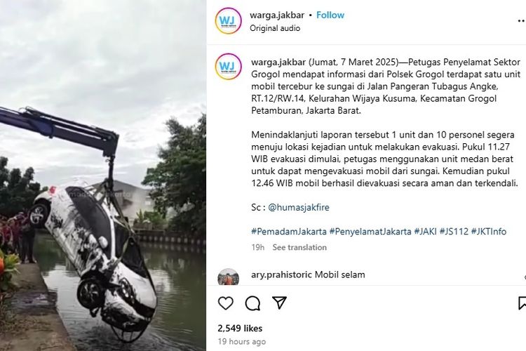 Sebuah Honda Brio putih bermandi lumpur dievakuasi dari dasar kali setelah dibawa sopir melaju oleng