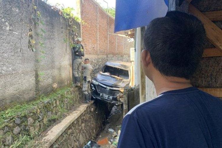 Yanto Suryanto kebingungan Daihatsu Xenia miliknya di garasi bisa hilang dan ditemukan tergencet dua tembok di atas selokan di Sukaluyu Cianjur