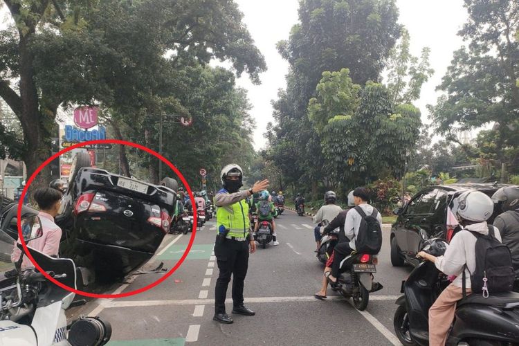 Kecelakaan di jalan raya Pajajaran, kota Bogor, Jawa Barat, Daihatsu Ayla telentang di bawah pohon, kolong tatap langit