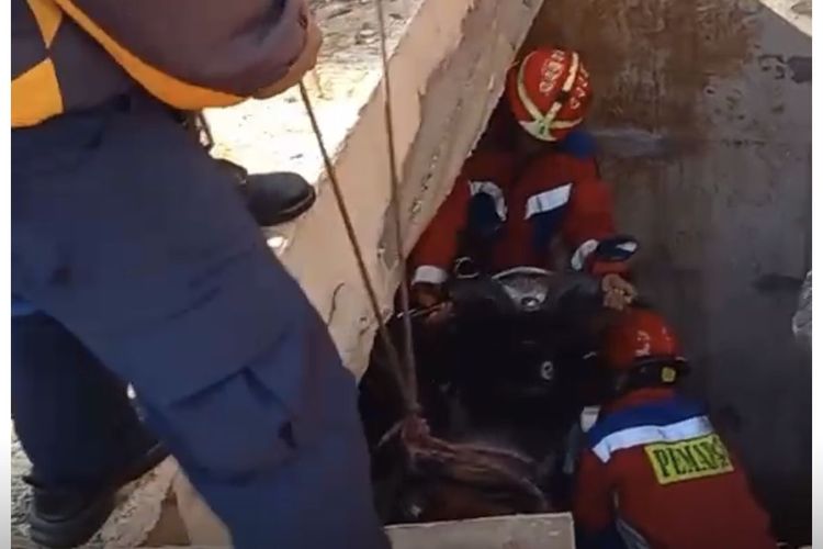 Honda BeAT yang kandas dari dalam galian proyek di Ciracas dievakuasi perlahan oleh Damkar. Begini awal mula kejadiannya