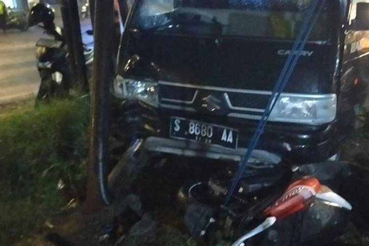 Suzuki Carry pikap obrak-abrik angkringan dan terjang Mio Soul usai ditabrak Honda CB dari belakang. Satu nyawa melayang