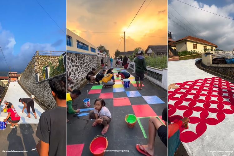 Warga bergotong royong mengecat jalan kampung dengan aneka mural penuh warna untuk merayakan Hari Ulang Tahun ke-80 Republik Indonesia.
