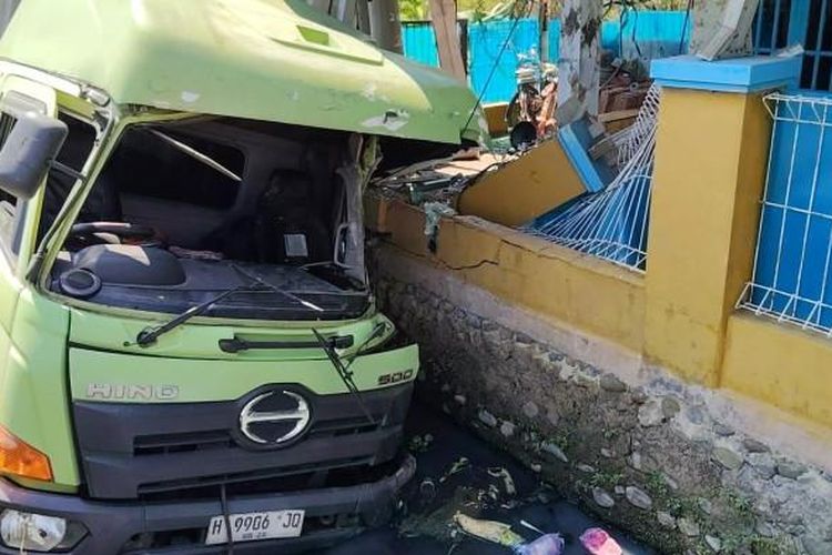 Truk boks hantam pagar rumah di jalu Pantura, Brebes. Sosok putih menyebrang yang disebut kernet masih jadi misteri sampai saat ini