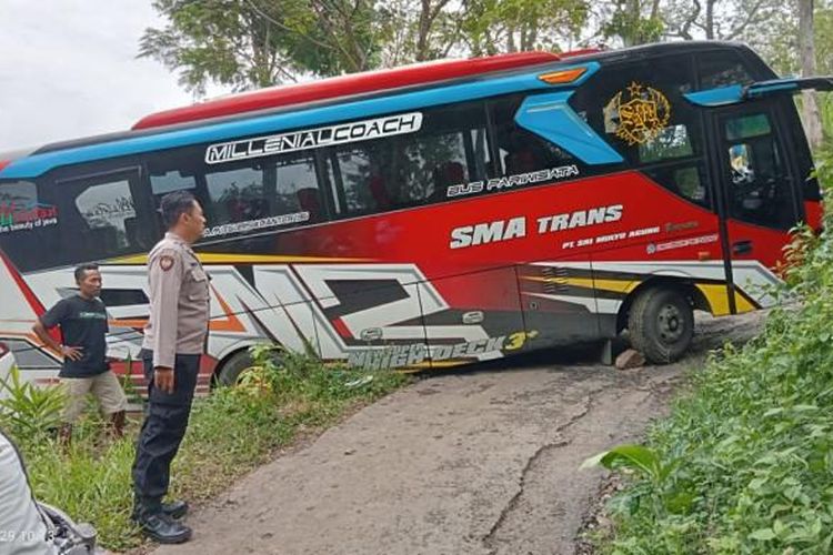 Bus Pariwisata rombongan peziarah nyasar di hutan Pati, sulit putar balik di jalan sempit dan licin.