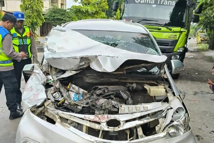 Toyota Avanza terkoyak kap mesin usai terlibat kecelakaan dengan dua truk di Kudus. Bermula dorongan kuat dari belakang