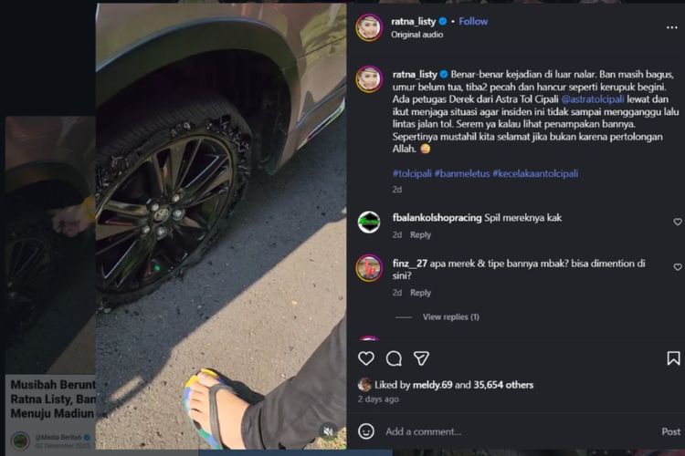 Dalam tayangan di akun instagram @ratna_listy, wanita berusia 52 tahun ini mengalami pecah ban di tol Cipali.