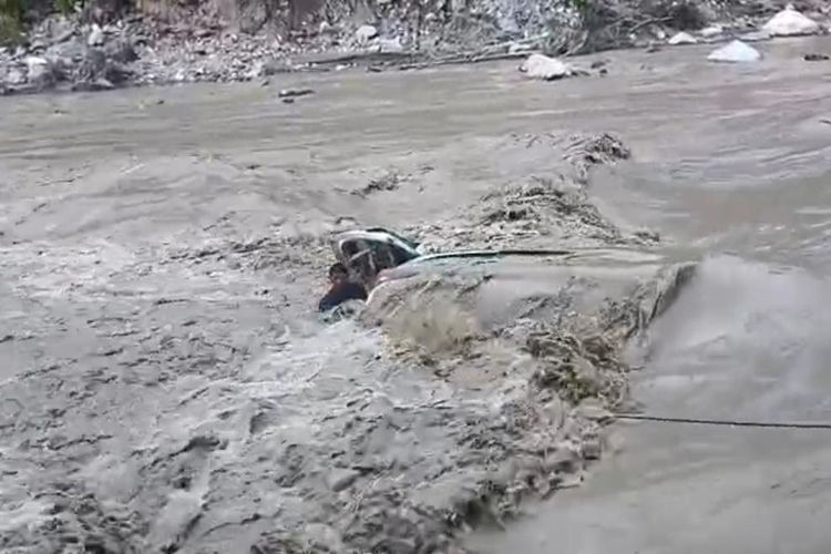 Mobil Dinas Camat Pantan Cuaca, Gayo Lues, Aceh hanyut di sungai Tripe setelah sejak 26 November 2025 terjebak di atas jembatan akibat banjir