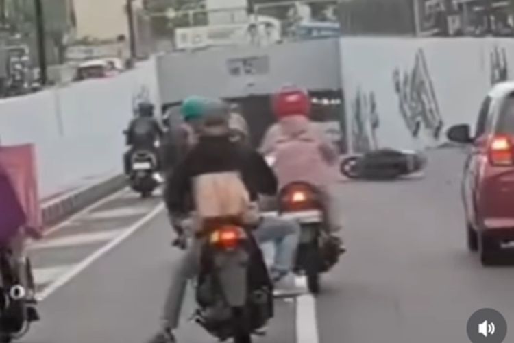 Akibat kelalaian satu pengendara motor yang berhenti seperti main sulap yang sulit diprediksi, dua pengendara lain harus terjatuh