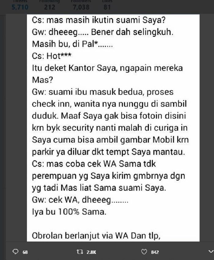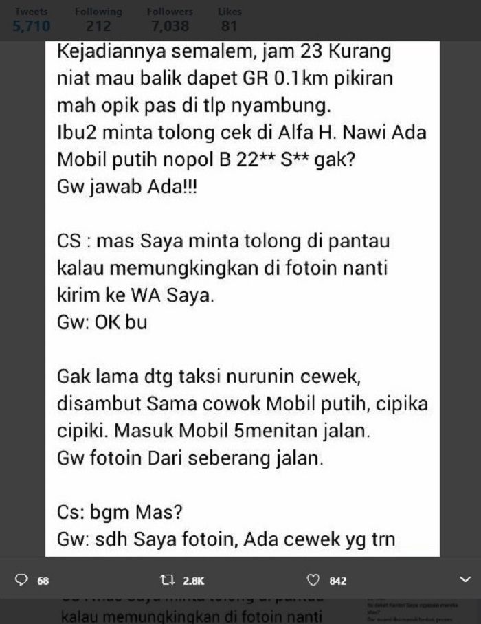 GridOto.com- Dalam sebuah postingan di twitter @DriverGojekPro diposting seorang driver ojek online menerima order untuk memata-matai seseorang.
