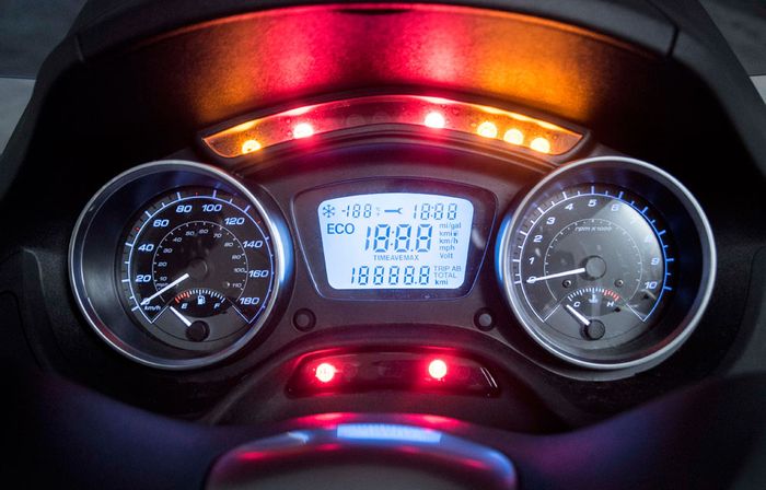 Sebelah kiri terdapat penunjuk kecepatan dan bensin, sedangkan di kanan ada takometer dan suhu mesin.