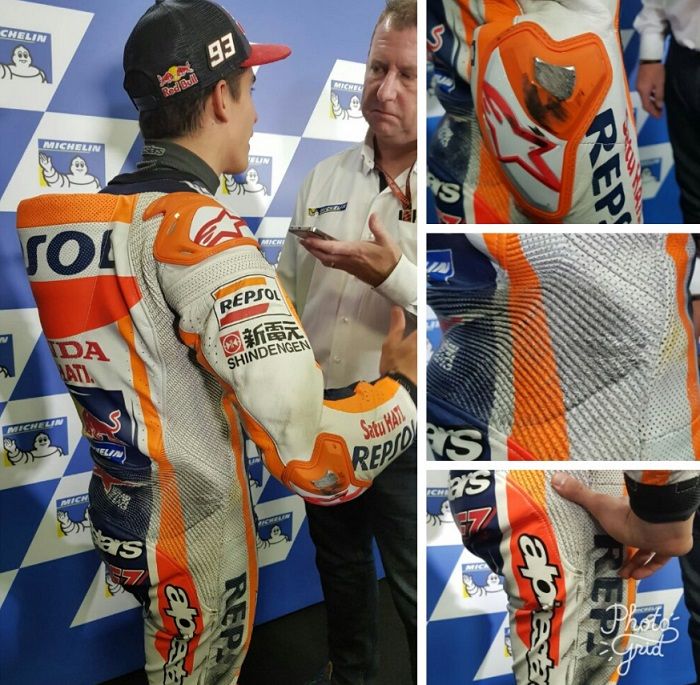 Begitu juga Marc Marquez yang tertangkap terlihat menghitam di bagian pinggang kanan dan elbow guard.