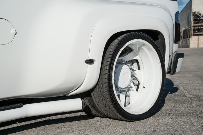 Chevy Silverado ini menggunakan pelek putih glossy ukuran 26 inci dari Forgiato dan ditemani oleh puluhan baut  berbentuk seperti paku.