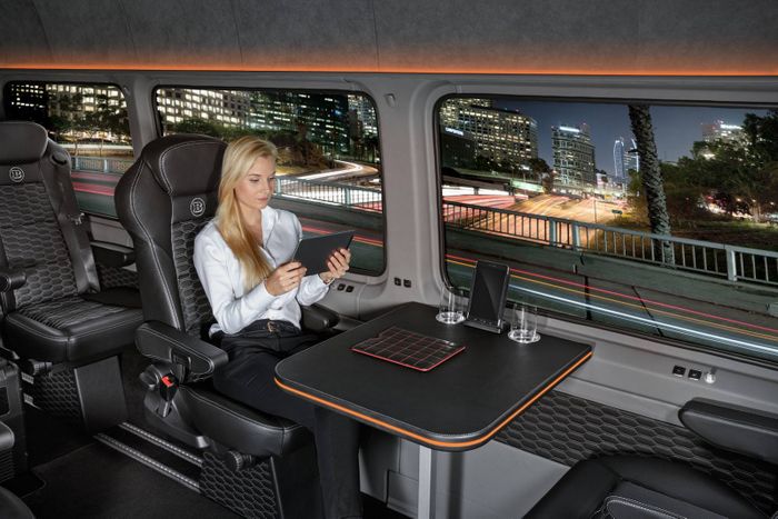 Sprinter ini juga dilengkapi 6 port USB, meja konferensi Brabus, sistem infotainment custom, 2 TV yang terpasang di atas dinding partisi, tablet 10 Inci.