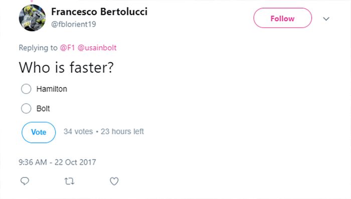 Bahkan saat akun Twitter resmi F1 membagikan kedatangan Bolt di sirkuit, ada Netizen yang membuat postingan berupa voting.