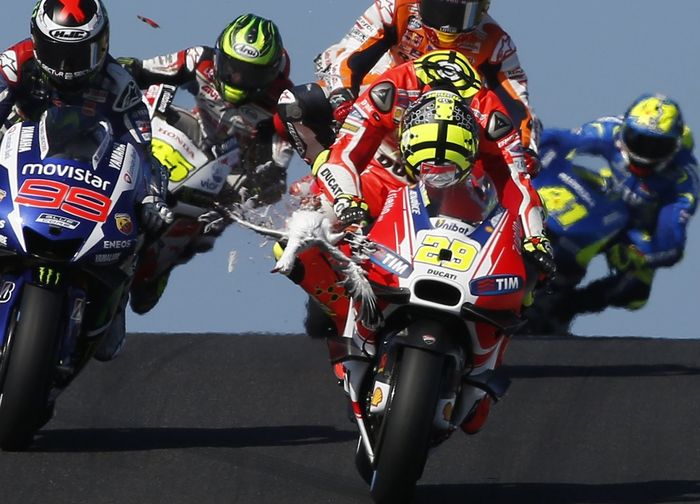 Mungkin cara gaya menungging Andrea Iannone melihat lawan sekaligus cara untuk menghindari burung laut yang menabrak motornya.