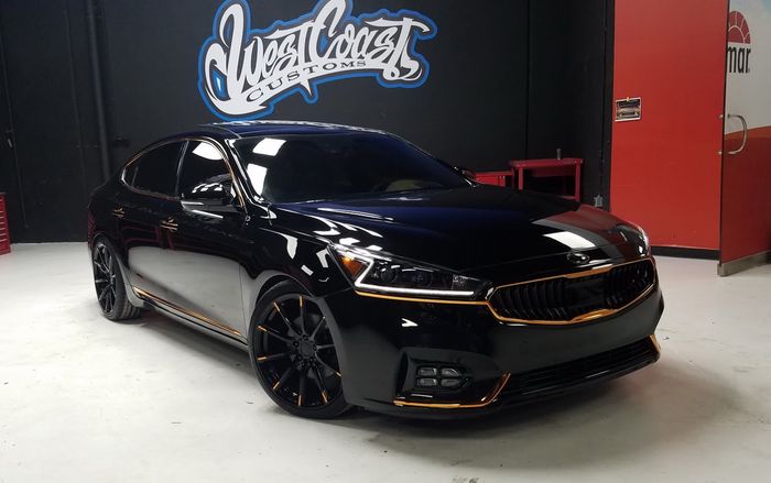 Kia Cadenza Obsidian juga dibuat oleh West Coast Customs dengan balutan warna hitam dan garis emas di sekitar gril dan bumper depan sebagai pemanis.