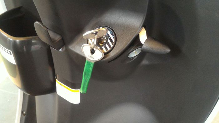 Di bawah setang hanya ada konsol kecil untuk menyimpan botol minum, lalu gantungan barang dan kunci kontak dengan tutup pengaman.