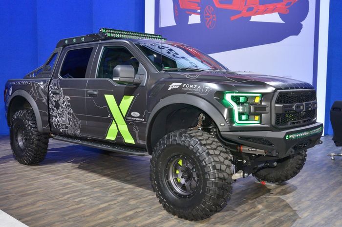 CJ Pony Parts F-150 adalah model off-road lain karena memiliki lift kit 7 inci, komponen suspensi berlapis, dan pelek Beadlock dengan ban BFG Mud-Terrain.